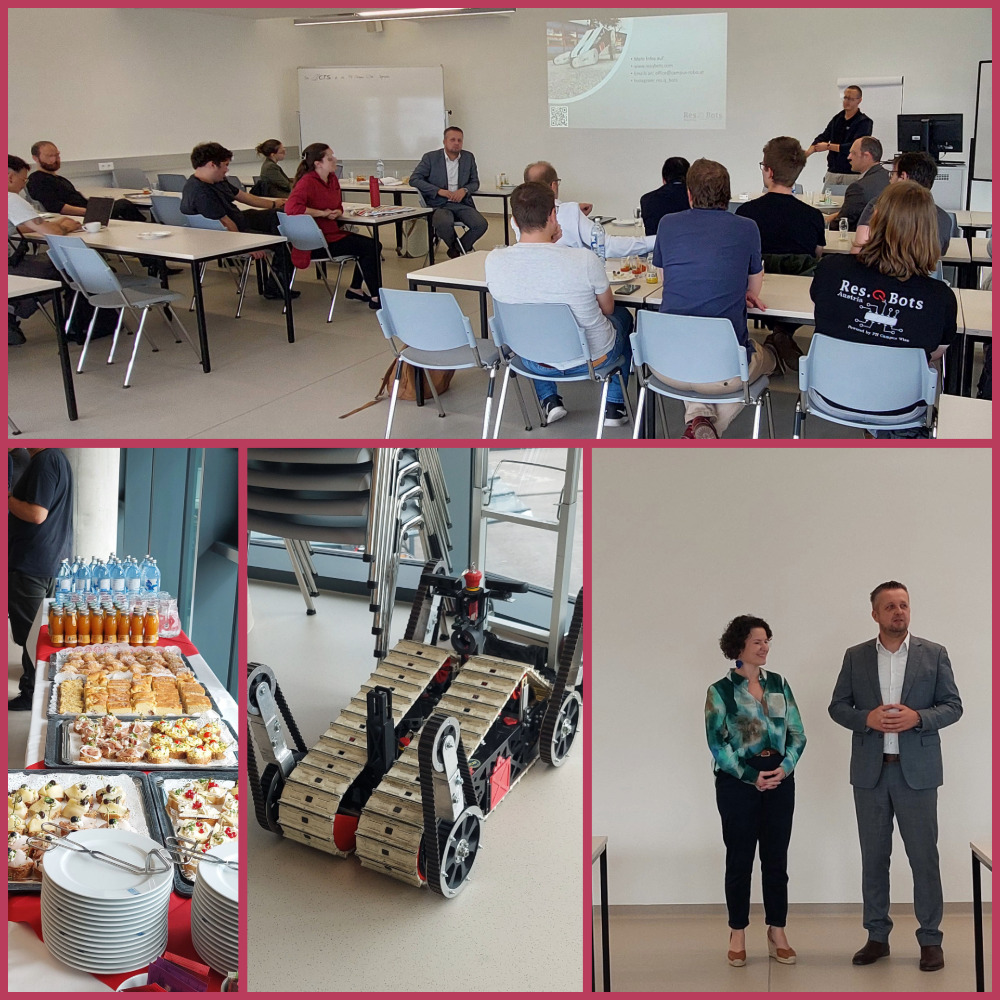 Anna Franzkowiak (Leitung CTS) und Heimo Sandtner (Rektor der FH Campus Wien) begrüßten am 26.09. 2024 zum gemeinsamen Robotic Lunch im neu eröffneten Gebäude der FH Campus Wien. Die vier Vorträge bei gutem Buffet kamen von Studiengangsleiter:innen, Bereichsleitungen bis hin zu engagierten Studierenden. Auch das Publikum war eine diverse Zusammenkunft an interessierten, diskussionsfreudigen Fachleuten aus unterschiedlichen Disziplinen.
